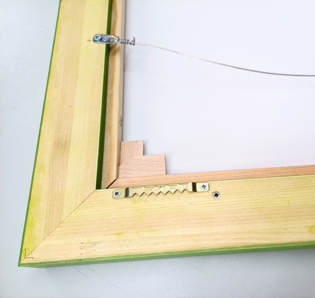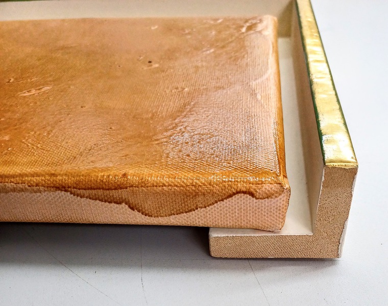 Im Gegensatz zu herkömmlichen Rahmen wird das Bild – meist ein Keilrahmenbild oder eine Holzplatte – von hinten in den Rahmen eingesetzt und von der Rückseite befestigt. Dadurch bleibt zwischen Bildkante und Rahmen eine gleichmäßige Distanz, die als schmaler Schatten sichtbar wird. Diese Fuge lässt das Kunstwerk besonders leicht und plastisch wirken.