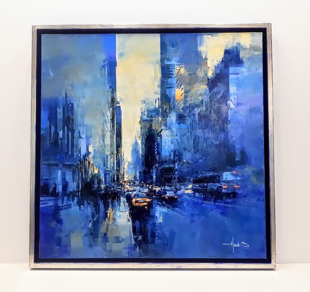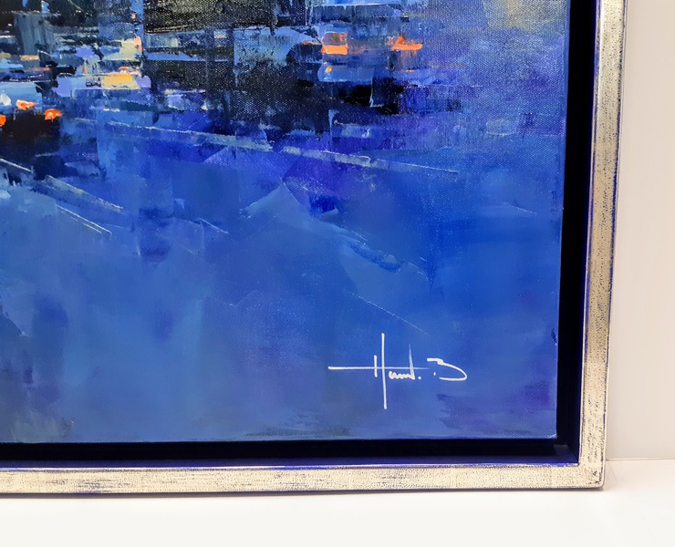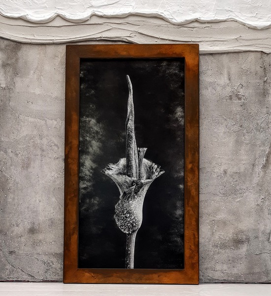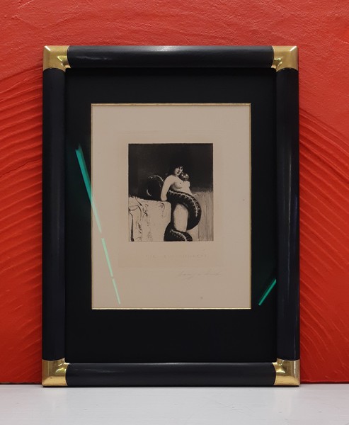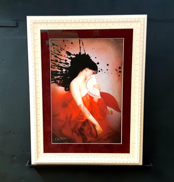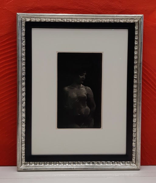 Gerahmt mit einem aussergewöhnlichen Rahmen aus unserem Vergolder-Atelier. Dieser Vergolderrahmen wurde mit echtem Blattgold belegt und auf Hochglanz poliert. Das schwarze Poliment wurde an den Kanten wieder durchgerieben. Somit entsteht eine Goldene Aura um das Bildnis Buddhas.