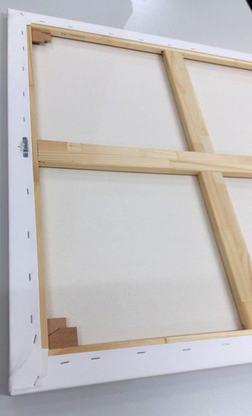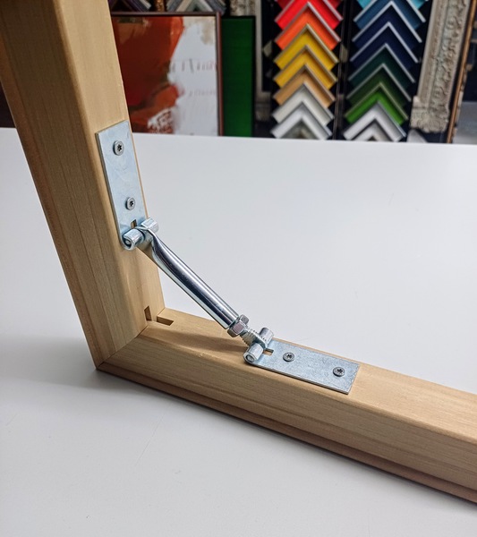 doppelter Verzapfung ausgestattet sind. Zu jedem Keilrahmen gehören 4 Leisten und 8 Keile. Bei größeren Bildformaten können nach Bedarf Querstreben oder Kreuze eingebaut werden um eine bessere
