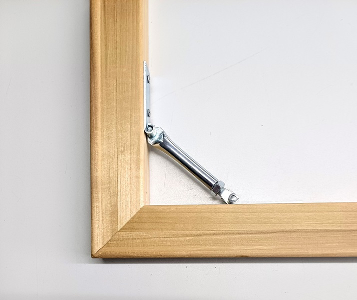 Die 4 Teile werden rechtwinklig zusammengesetzt und ggf. Strebe oder Kreuz eingefügt. Das Gewebe wird auf diese Leisten gespannt und kann durch Einschlagen der Keile immer wieder nachgespannt