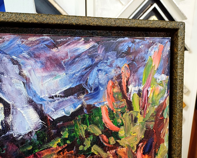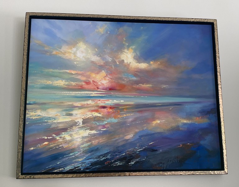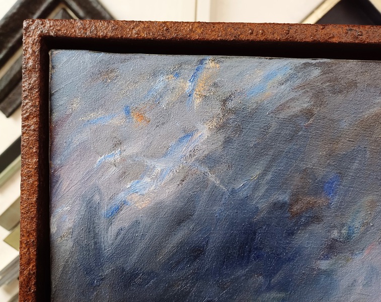 Handgefertigte Schattenfugenrahmen für eine Serie von Ölgemälden. Die Oberflächen der Schattenfugenrahmen wurden farblich passend zu den Ölgemälden in einer speziellen Oberflächentechnik individuell gestaltet.
