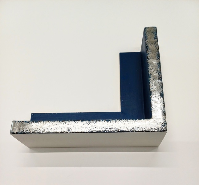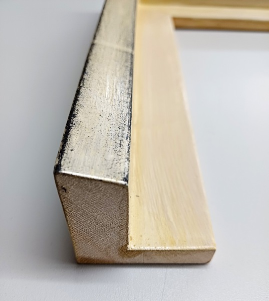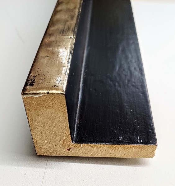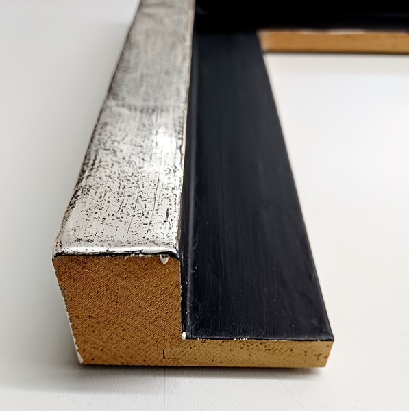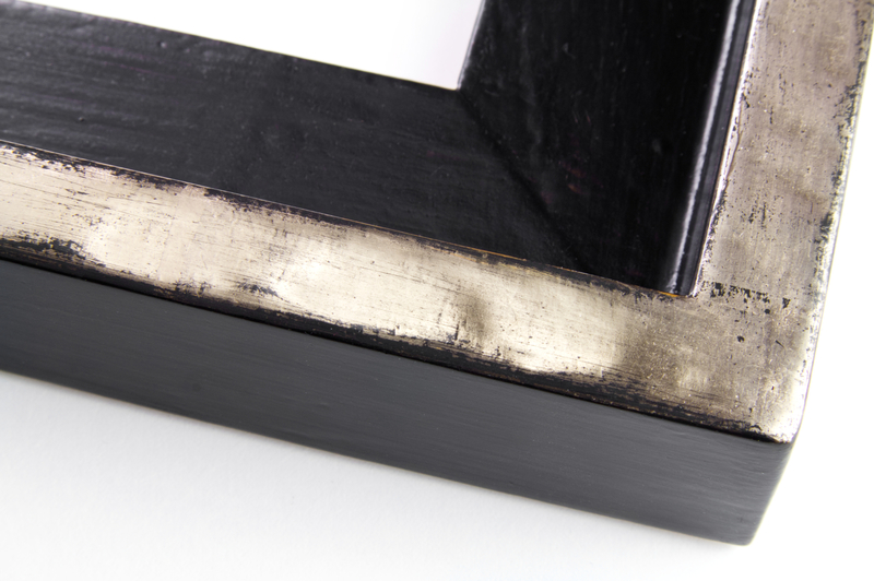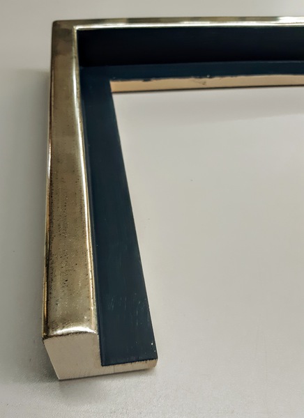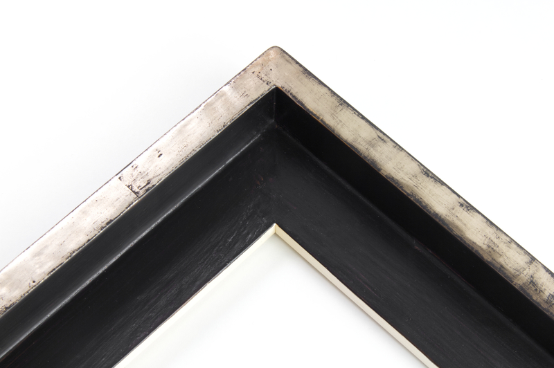 Handgefertigter Schattenfugenrahmen mit Blattsilber auf schwarzem Poliment. 35 mm hoch, Sicht 10 mm. Aussenmaß: 180 x 62 cm