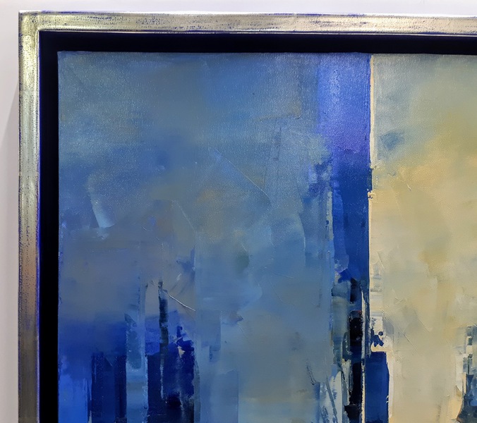 Handgefertigte Schattenfugenrahmen für eine Serie von Ölgemälden. Die Oberflächen der Schattenfugenrahmen wurden in unserem Vergolder Atelier von Hand vergoldet und individuell farblich zu jedem Kunstwerk gestaltet.