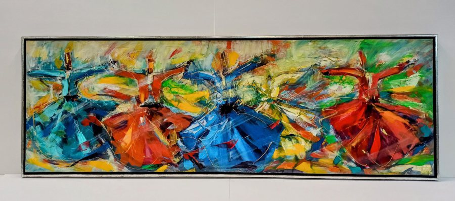XXL-Einrahmung eines Ölgemäldes (Tanzende Derwische) in einen maßgefertigten Schattenfugenrahmen Silber-Schwarz