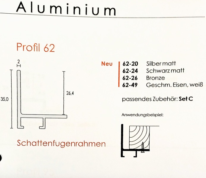Aluminium-Schattenfugen-Profile führen wir in unterschiedlichen Oberflächen-Designs und Querschnítten. Wir fertigen daraus in unserem Rahmen-Atelier individuelle Schattenfugenrahmen nach Maß für Ihre Kunst.