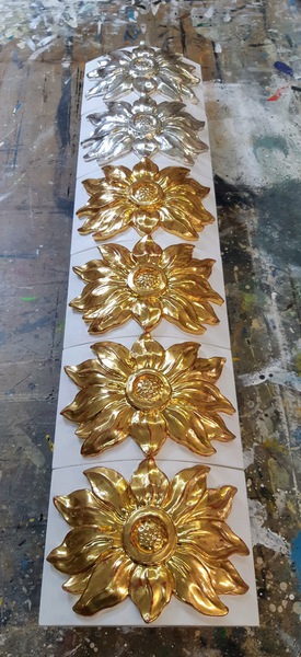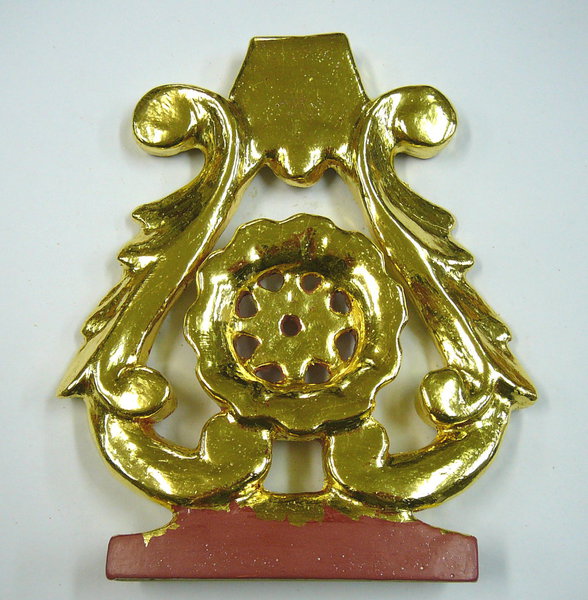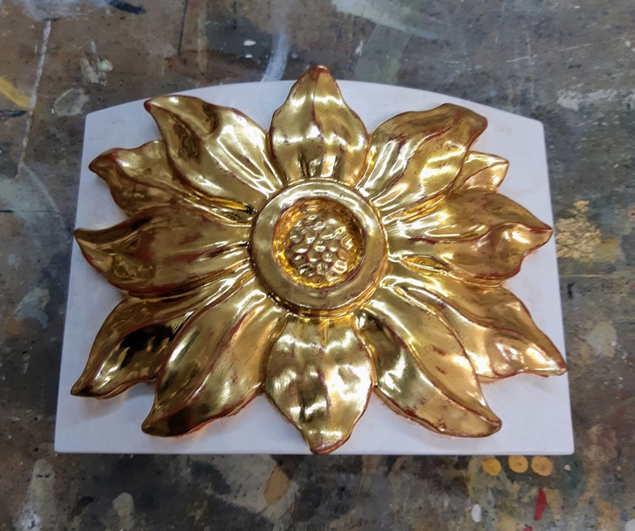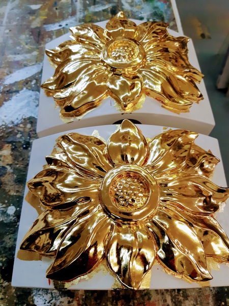 Blüten geschnitzt aus Lindenholz, Grundierung mit Kreidegrund, rotes Poliment als Haftgrund für das Blattgold. 23 Karat Blattgold und 12 Karat Weißgold von Hand poliert mit dem Achat. Anschließend Durchrieb und Lackierung mit Zaponlack.